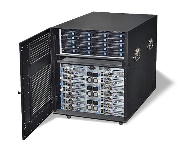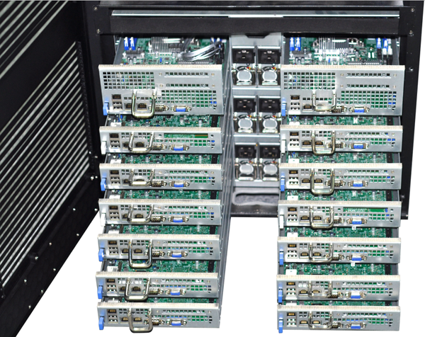 Ebpay电子融合一体机就是解决环境使用问题而推出的综合性计算产品,它不需要专业的机房设施,不需要专业的配电和空调设备,放在办公室或实验室接墙电就可使用, 具有低噪音、低功耗等特点。最高可以安装14个双路XEON E5 处理器的刀片服务器,48个外置热插拔硬盘存储,内置一个万兆网络交换机安装空间,带有整体状态显示和控制系统,内部散热和防尘处理。专为办公室应用环境 设计,它在众多方面超越了传统机架式服务器、刀片服务器和机群服务器,是高稳定、高性能、低环境要求的新一代桌边型高性能计算机。它采用整体优化的设计, 有效降低了系统功耗,再加上其人性化的设计、很强的系统扩展能力、卓越的性价比和计算密度,可以覆盖更广泛的个人及工作组用户对高性能计算的需求,与传统 的高性能计算机相比,Ebpay电子融合一体机可给予更有竞争力的整体解决方案,是更好满足中小高性能计算需求的理想平台。下图为14个刀片打开效果图: